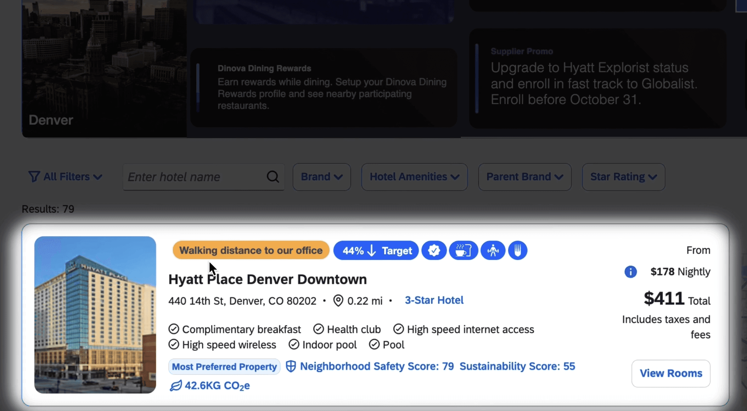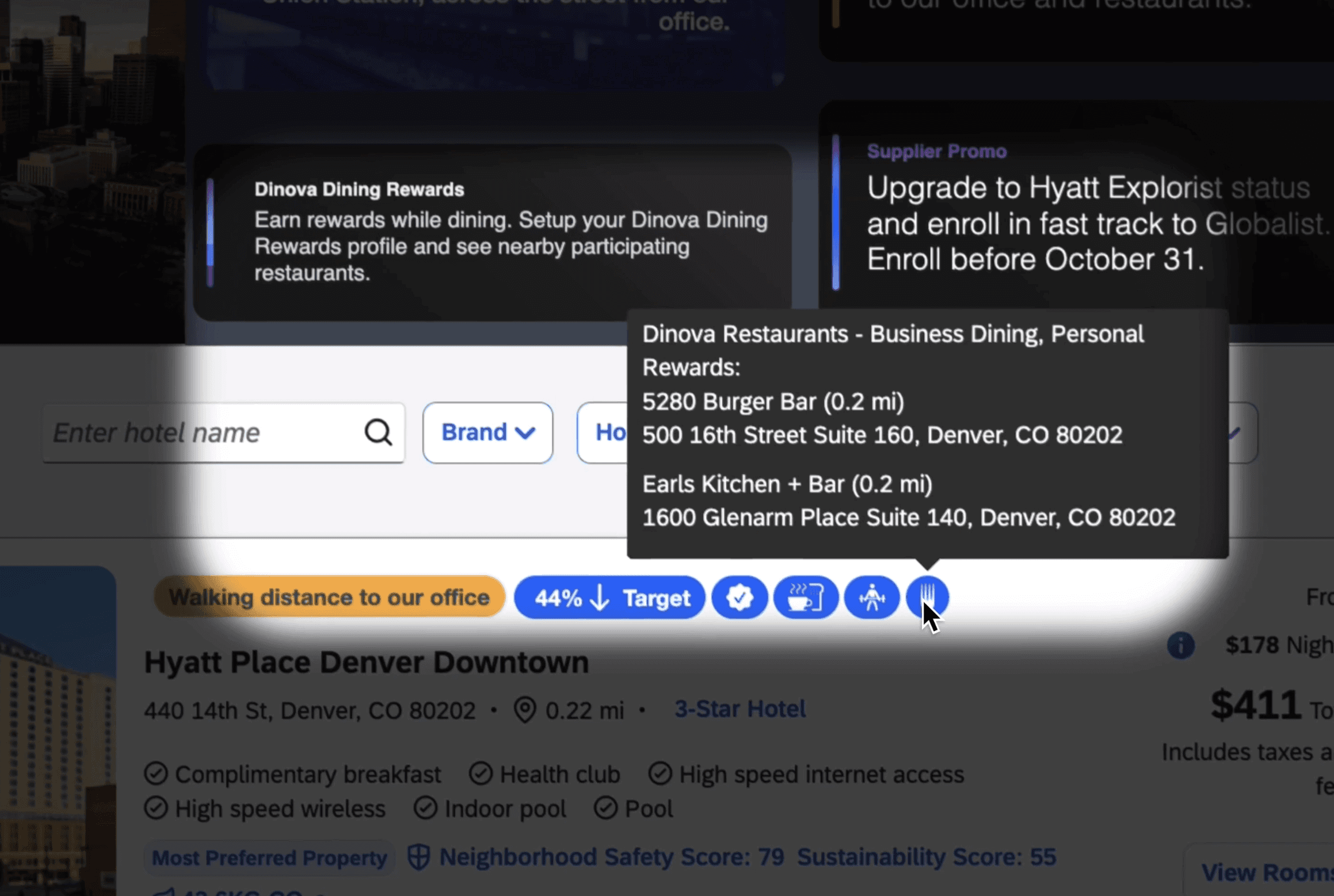 Go beyond the icons. Custom attributes, Supplier Notes, and Supplier Promos surface exactly what matters — partner loyalty upgrades, walking distance to the office, preferred dining networks, and any detail tied to your negotiated rates.