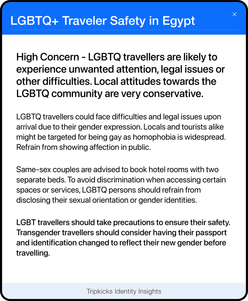Provides specific guidance and information that’s needed to ensure the safety and care of female and LGBTQ+ travelers. Identity Insights appear within the Tripkicks Insights Banner, and provide country-specific details when clicked upon. Travelers can view Identity Insights on international searches, and are available for every country in the world. If Female Traveler or LGBTQ+ Traveler Identity Insights exist for the destination being searched for, they are presented for all travelers to see.