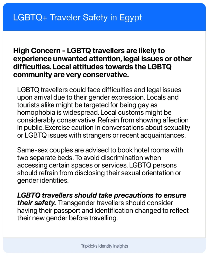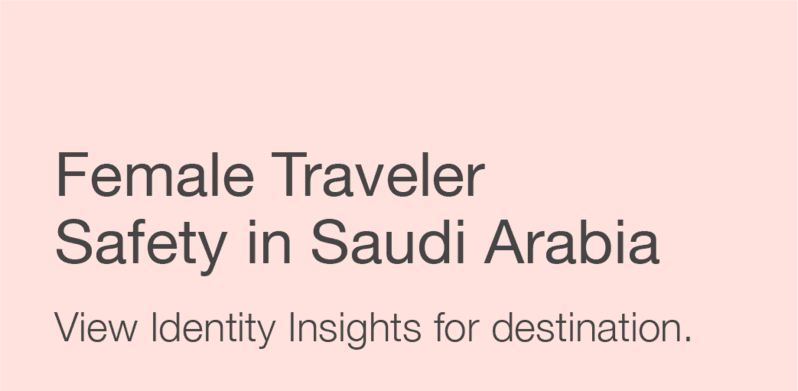 Identity Insights display safety information for international destinations when extra care should be taken by Female Travelers or LGBTQ+ Travelers.