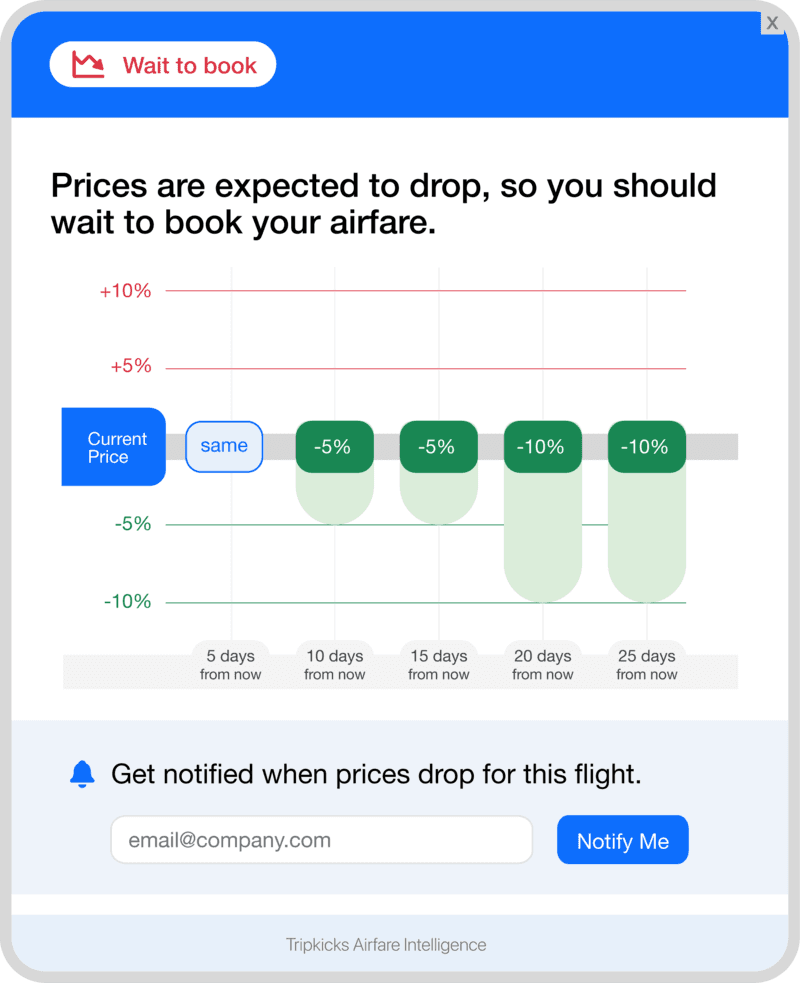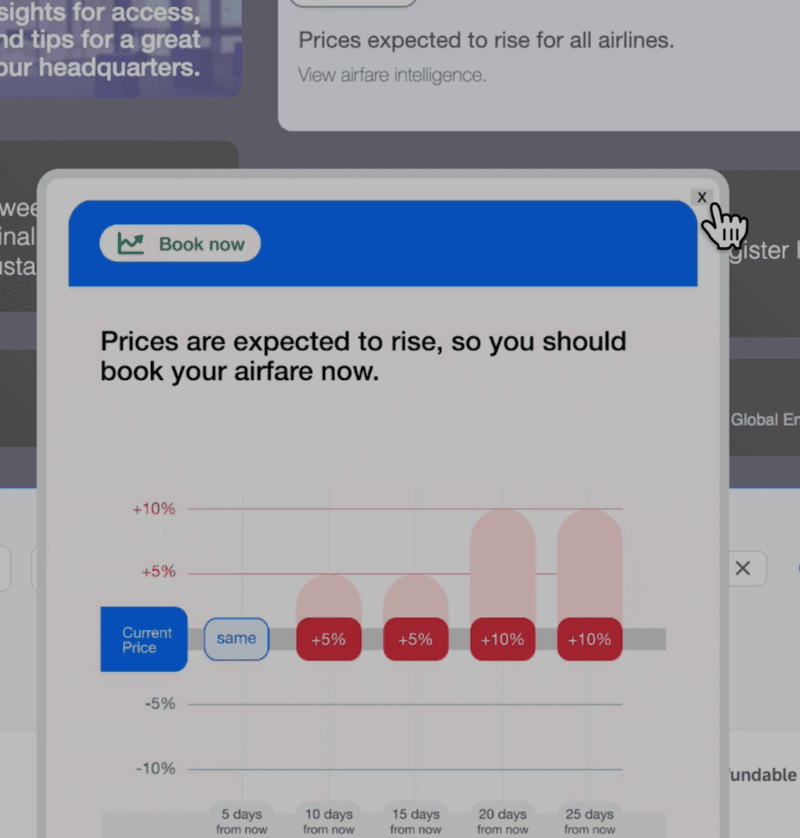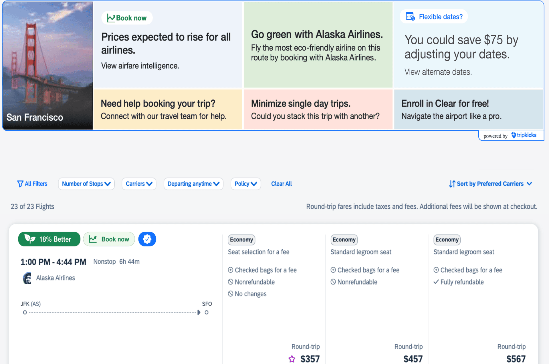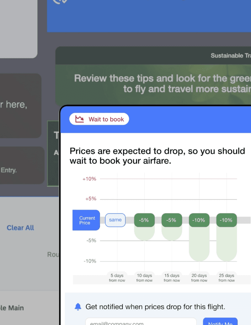 Dynamic messaging to help travelers find the best time to purchase airline tickets, based on historical data and current market trends. 'Book now' guidance appears when prices are expected to rise, and travelers can be notified when prices are expected to drop. When significant cost savings are possible with alternate dates, travelers see the savings potential of shifting. Within search results, carrier-specific trends display if prices are rising or expected to drop. This connection turns airfare data into actionable, real-time guidance at the point of booking -- not a report after the fact.
