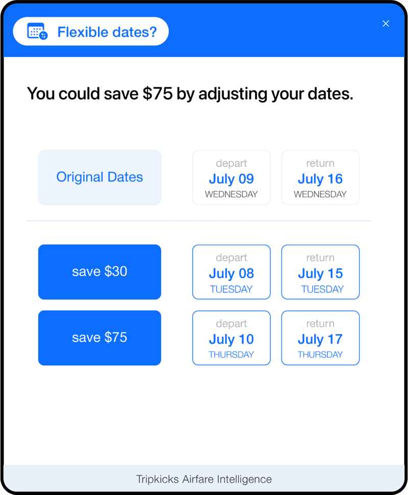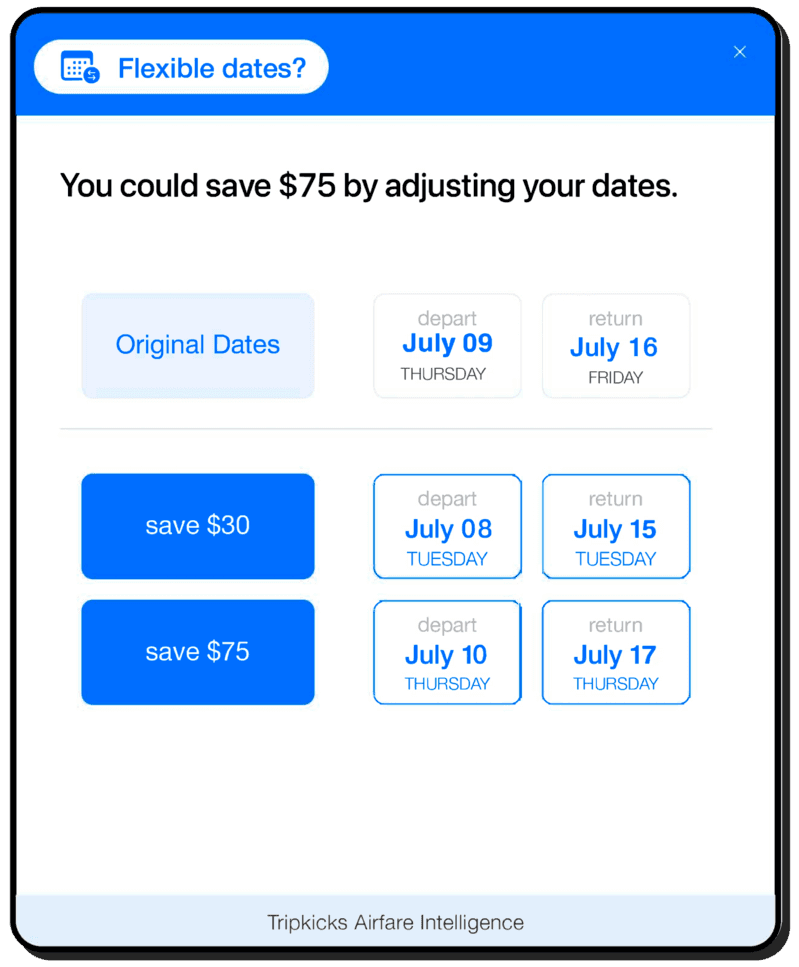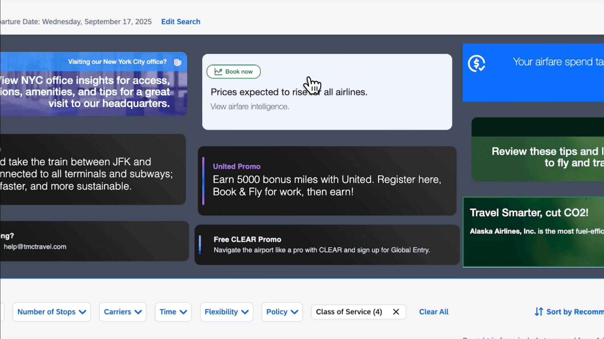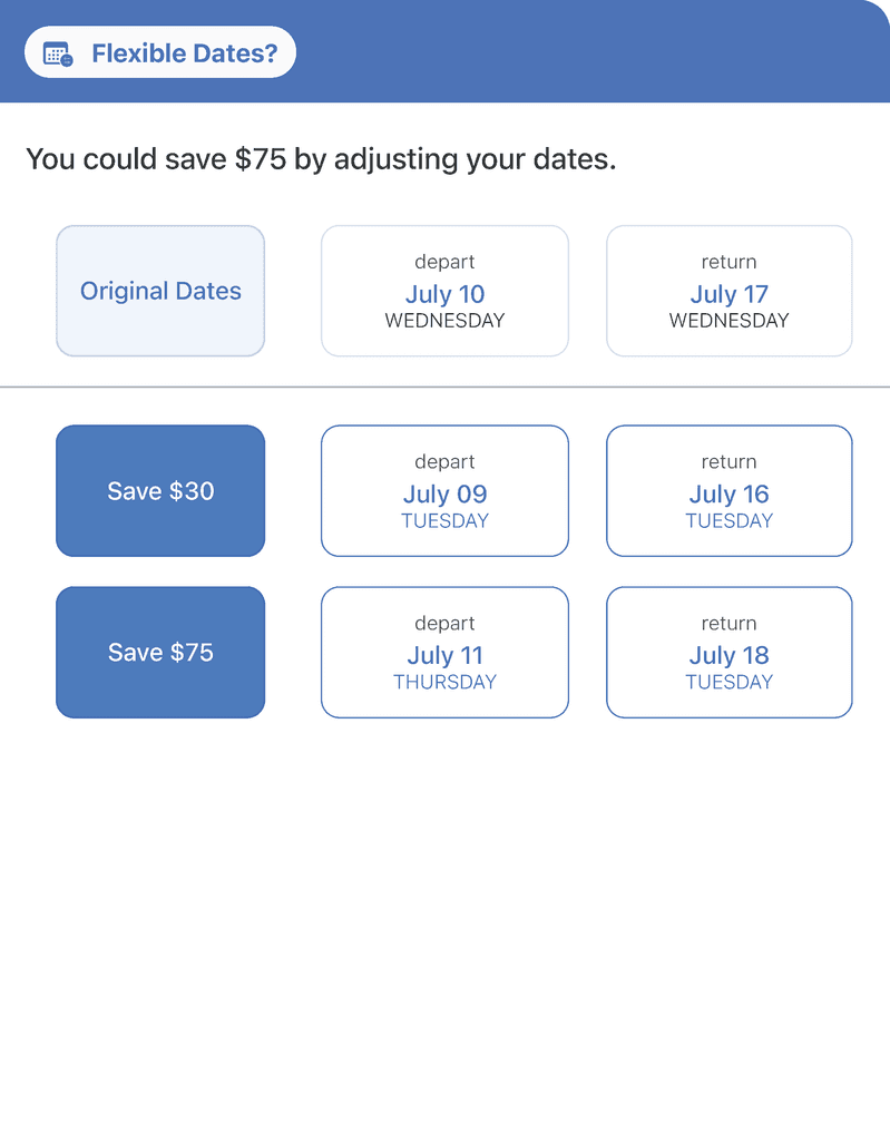 Dynamic messaging to help travelers find the best time to purchase airline tickets, based on historical data and current market trends. 'Book now' guidance appears when prices are expected to rise, and travelers can be notified when prices are expected to drop. When significant cost savings are possible with alternate dates, travelers see the savings potential of shifting. Within search results, carrier-specific trends display if prices are rising or expected to drop. This connection turns airfare data into actionable, real-time guidance at the point of booking -- not a report after the fact.
