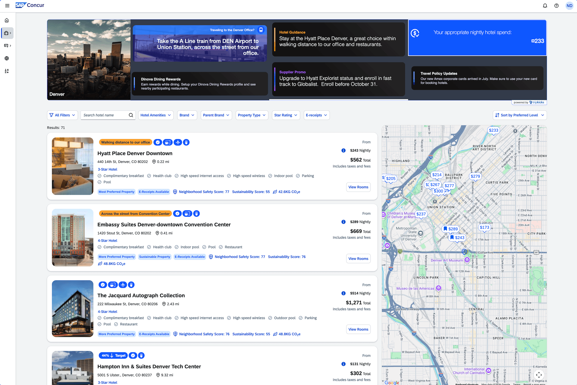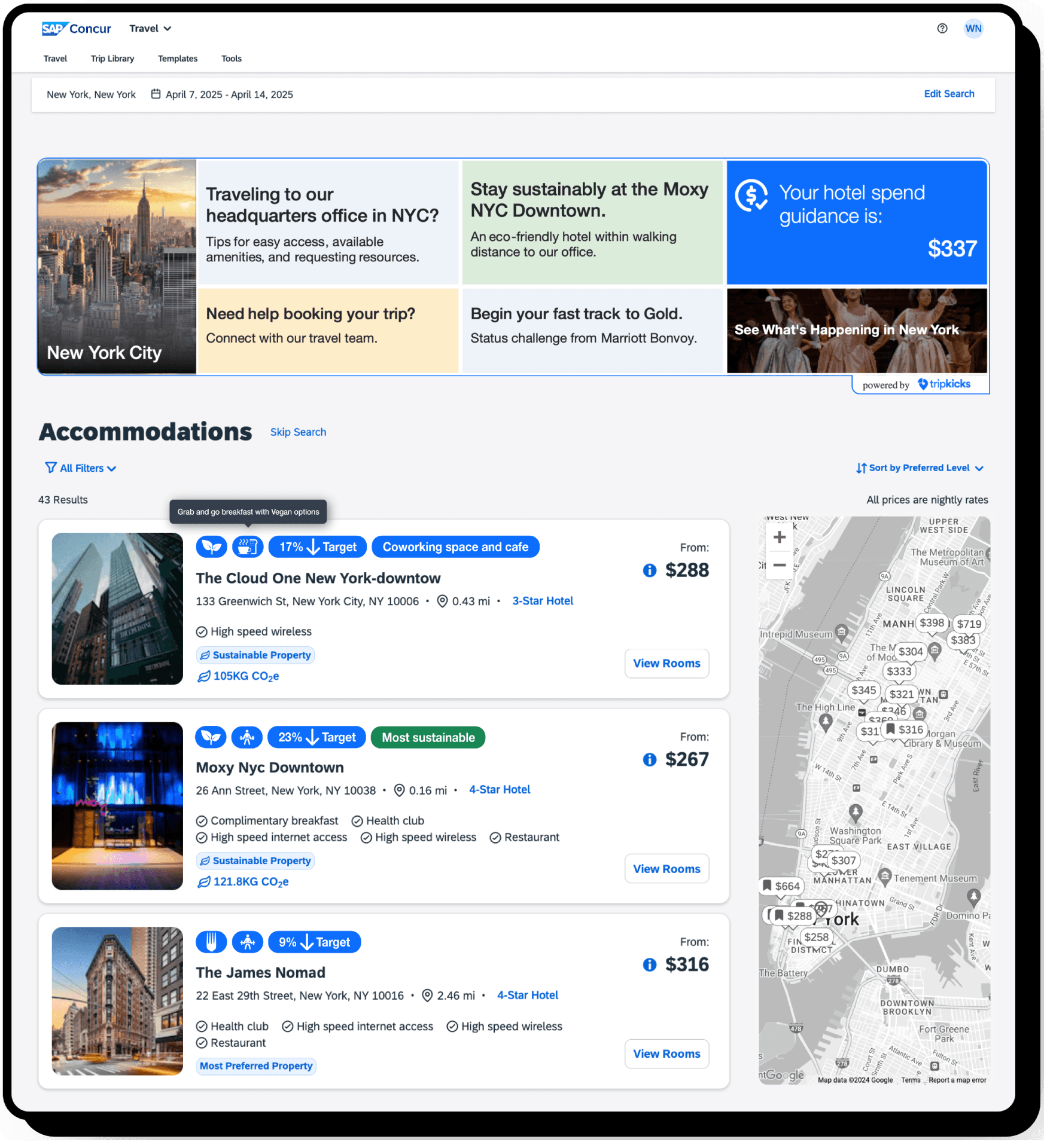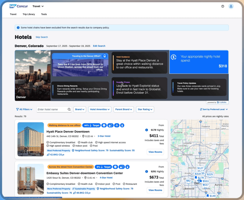 The Hotel Search touchpoint activates during lodging searches in Concur. This is where Catalyst has the greatest impact on hotel spend -- guiding travelers toward preferred properties, negotiated rates, and sustainable options. Tiles and inline notes display supplier attributes (breakfast included, free cancellation, parking, SBTi commitment), dynamic rate targets showing whether current prices are above or below benchmark, peer comparison data (what colleagues typically book in this city), and sustainability indicators (LEED certification, carbon scores). Custom banner insights can highlight specific hotel programs or promotions.